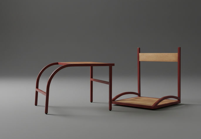 Propuesta inspirada en el estilo Japandi, de forma sencilla y modular, pensada para espacios reducidos. Fabricada en hierro y madera con acabados en rojo óxido y barniz natural, combina funcionalidad y estética. Su concepto, Piel en Brasas, evoca la dualidad entre lo quebrado y lo ardiente, donde la suavidad y la dureza conviven como memoria del fuego.